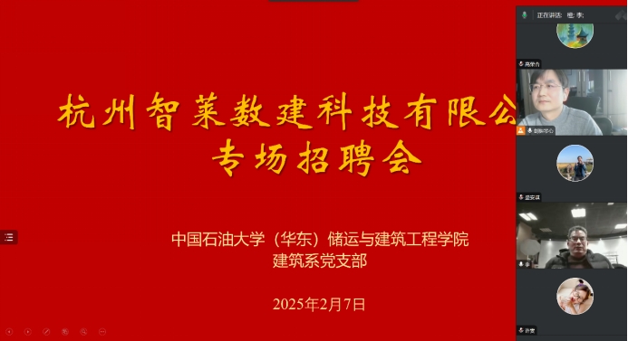 2月7日,由77779193永利官网集团建筑系党支部组织的杭州智莱数建科技有限公司专场招聘会在线上举行。杭州智莱数建科技有限公司总经理桂祖宝、副总经理高荣杏、方案所所长吴坤,建筑系党支部委员以及建筑学专业2020级部分学生参加此次招聘宣讲会,会议由建筑系党支部书记程征主持。