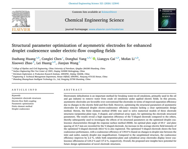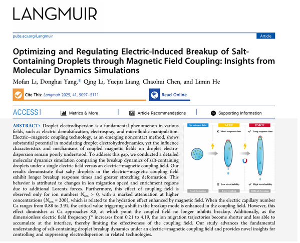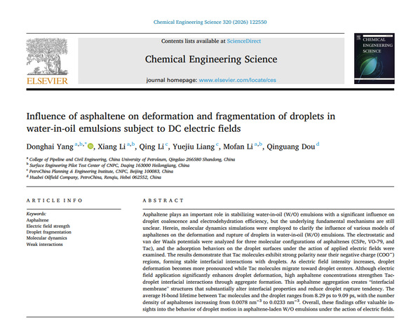相关研究成果分别以“Influence of asphaltene on deformation and fragmentation of droplets in water-in-oil emulsions subject to DC electric fields”,“Structural parameter optimization of asymmetric electrodes for enhanced droplet coalescence under electric-flow coupling fields”和“Optimizing and regulating electric-induced breakup of salt-containing droplet through magnetic field coupling: Insights from molecular dynamics simulations”发表在《Chemical Engineering Science》期刊(中科院二区,IF=4.3)和《Langmuir》期刊(中科院二区,IF=3.9)。《Chemical Engineering Science》和《Langmuir》均为化学工程和能源领域顶级期刊。论文第一/二作者分别为在读硕士生李想、在读硕士生黄达章和在读博士生李默翻,通讯作者为杨东海教授,永利集团为第一署名单位和唯一通讯单位。上述研究获得国家自然科学基金面上项目、山东省自然科学基金面上项目以及泰山学者青年专家计划资助。