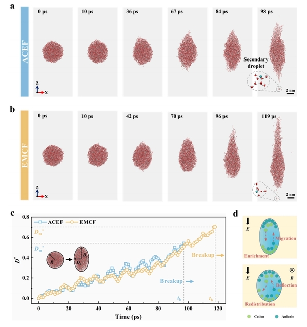 采用高速显微实验与分子动力学模拟相结合的方法,研究了电-磁耦合场作用下的液滴振荡变形与破裂行为,阐明了电毛细数、无量纲频率、无量纲浓度和奥内佐格数等参数对液滴动力学特征的影响规律,揭示了液滴响应期间无机盐离子的迁移与富集特性。研究发现电-磁耦合场削弱了液滴最大响应振幅,有效抑制了液滴电分散现象,这一削弱效应源于无机盐离子迁移偏转导致的液滴表面电荷密度的降低。该研究成果完善了多物理场耦合作用下的多相分离与液滴动力学理论体系。