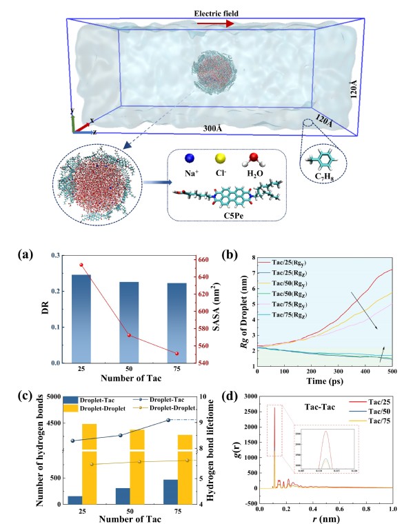 采用非平衡分子动力学模拟方法,系统研究了电场作用下沥青质对液滴变形的影响机制。同时,基于量子化学计算和独立梯度模型全面分析了沥青质分子与水分子间的弱相互作用类型与强度。结合模拟与计算结果,发现沥青质通过在油水界面构建稳定的氢键网络,从而抑制了液滴在电场中的变形与破碎。该研究成果从分子尺度揭示了沥青质稳定乳状液的微观机制,为优化原油电脱水工艺提供了理论依据。